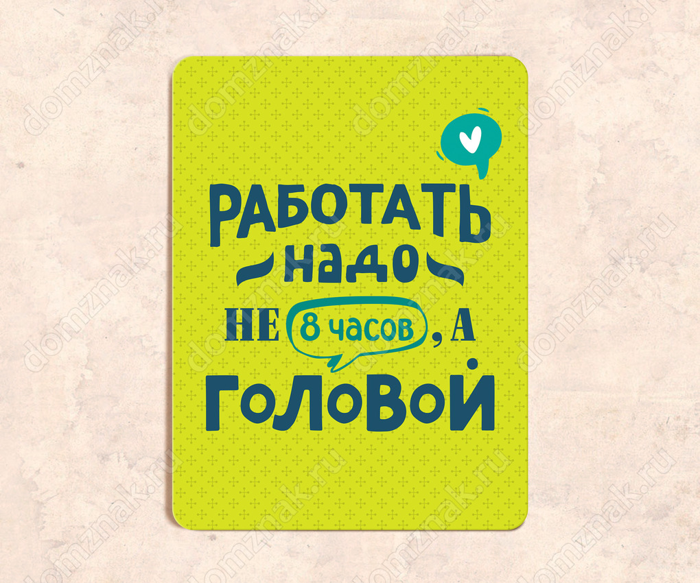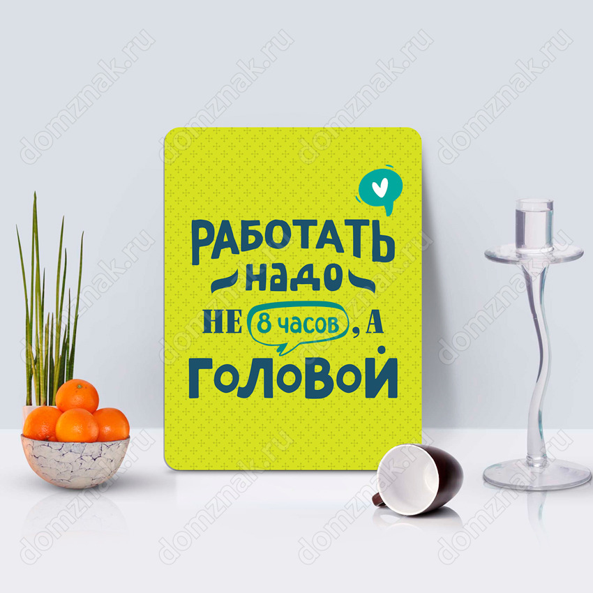 Табличка «Работать надо не 8 часов, а головой» изготовлена из пластика ПВХ, толщиной 4 мм. Изображение наносится по технологии УФ-печати. Табличка предназначена для использования как в помещении, так и на улице.
